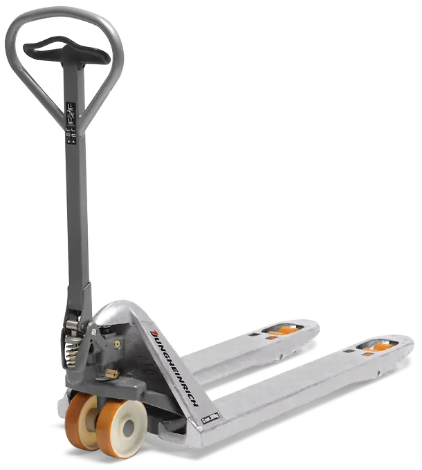 Las transpaletas manuales AM G20 son especialmente compactas y robustas y están galvanizadas por inmersión en caliente. Por tanto, son especialmente idóneas para aplicaciones en el exterior y en ambientes húmedos, como supermercados o explotaciones frutícolas.