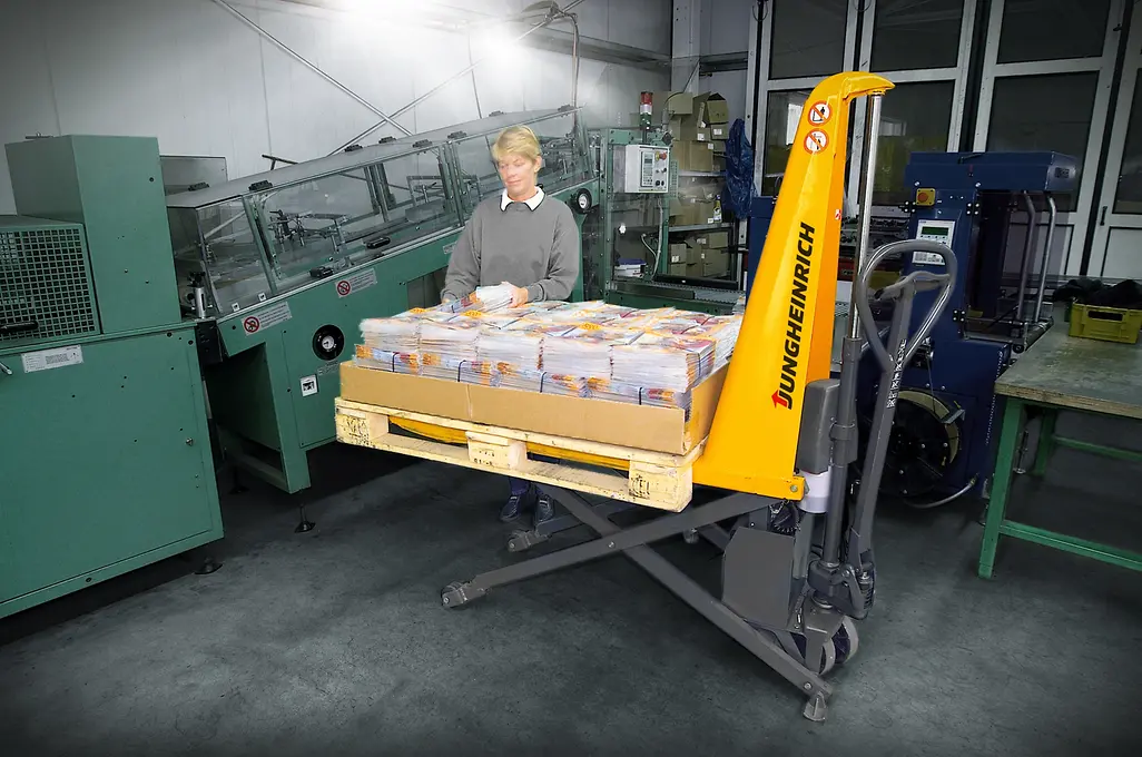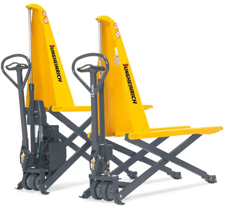 Con esta combinación de mesa elevadora y transpaleta manual se puede mover todo tipo de mercancías rápida y fácilmente, pudiendo elevarlas en cualquier momento a una altura en la que no se fuerza la espalda. Otra contribución a la ergonomía la presta el cabezal de barra timón optimizado y fácil de usar, tanto para zurdos como para diestros. Para adaptarse a sus necesidades, las AMX también están disponibles con hidráulica manual. En este modelo, la carga se apoya con estabilizadores adicionales a partir de una altura de 400 mm. La elevación se realiza con tecnología de elevación rápida para ahorrar tiempo. Alternativamente, la AMX 10e también está disponible en versión electrohidráulica. Este modelo permite realizar cambios de altura frecuentes de forma rápida y fácil, pulsando simplemente un botón.