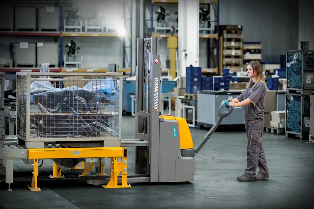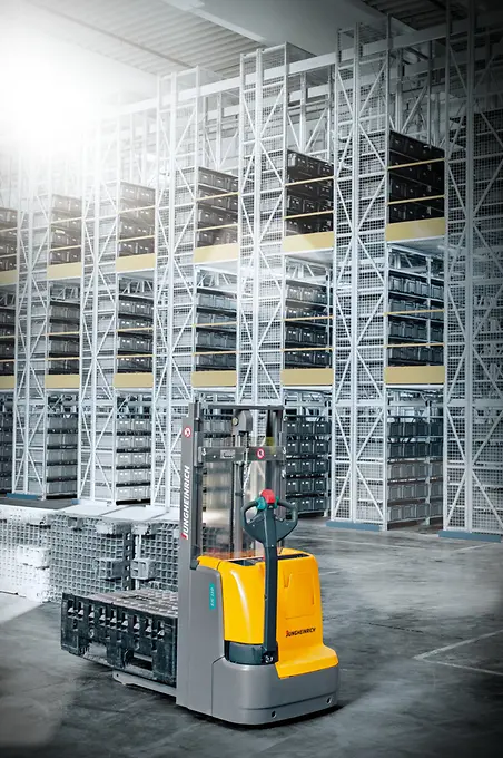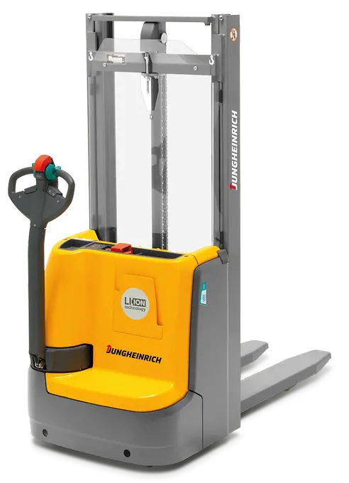 Las robustas y ágiles apiladoras de conductor acompañante de la serie EJC 1 son unas ayudantes potentes y eficientes para las tareas de apilado y de transporte en su almacén. Con su reducido ancho de trabajo son especialmente apropiadas para mover cargas en espacios estrechos.