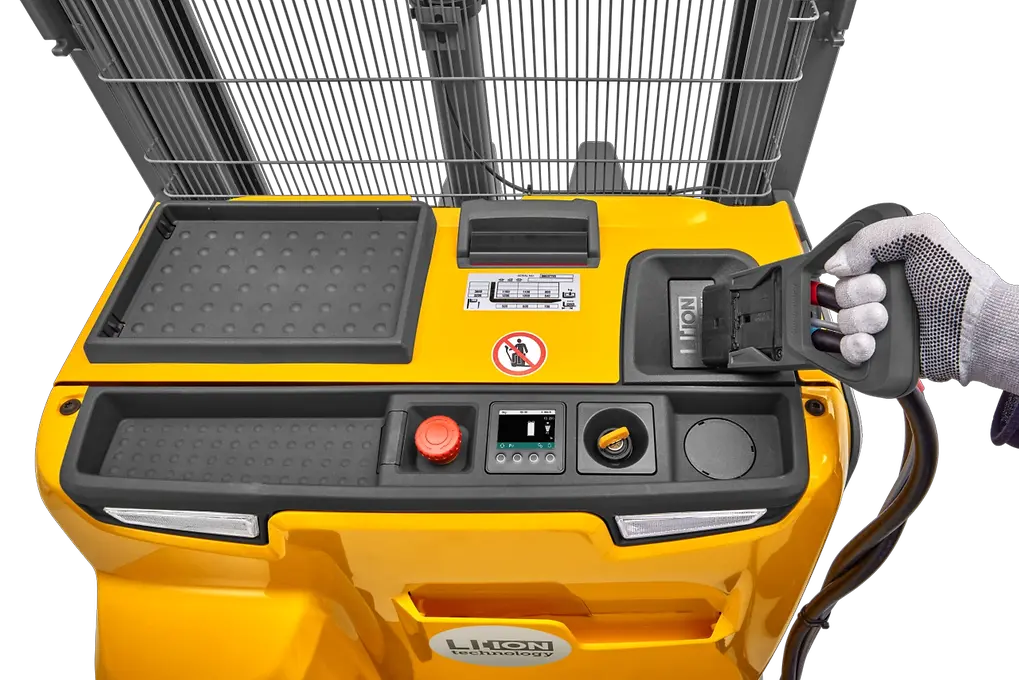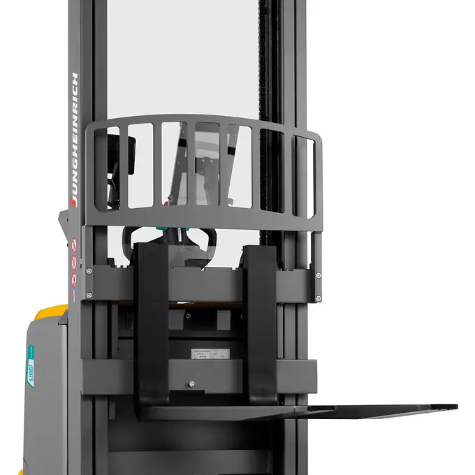 Los brazos porteadores se encuentran fuera del contorno y las horquillas forjadas pueden bajarse hasta el suelo. De esta forma, las cargas se pueden recoger fácilmente. Además, las horquillas están disponibles en distintas variantes. De manera adicional, nuestros sistemas de asistencia operationCONTROL, que lanzan una advertencia al superar la capacidad de carga restante o el preselector de alturas de elevación positionCONTROL garantizan un manejo seguro y eficiente de la mercancía. Los apiladores de barra timón con acompañante están equipados con un potente motor de corriente trifásico que asegura una rutina diaria eficiente en el almacén gracias a una rápida aceleración. El motor de elevación también convence por su gran potencia siendo a la vez silencioso, y permite, en combinación con el sistema hidráulico optimizado, un apilado especialmente suave y preciso. De esta forma, el motor de elevación también contribuye a que el trabajo se pueda realizar de forma segura y sin fatiga.