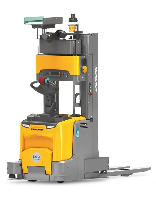 Un motor de corriente trifásica de 2,8 kW garantiza un rendimiento constante, mientras el potente motor de elevación con regulación eléctrica proporciona una elevación y un descenso suaves y silenciosos, también en grandes alturas de elevación. La construcción robusta con bastidor de acero y la estructura cerrada del mismo ofrecen un alto grado de seguridad. El uso de nuestros vehículos de guiado automático en aplicaciones mixtas queda garantizado mediante sistemas de seguridad, como los escáneres de serie, para la protección de las personas. Estos escanean, según la velocidad, el recorrido en busca de obstáculos: en sentido de la tracción, en sentido de la carga y al transitar una curva. La navegación se realiza mediante láser. Para ello se pueden emplear reflectores en el recorrido o una combinación de reflectores y características periféricas. Este apilador, cuyo desarrollo está basado en nuestras carretillas de serie, puede integrarse sin ningún problema en las estructuras IT ya existentes o utilizarse también como sistema «stand alone».