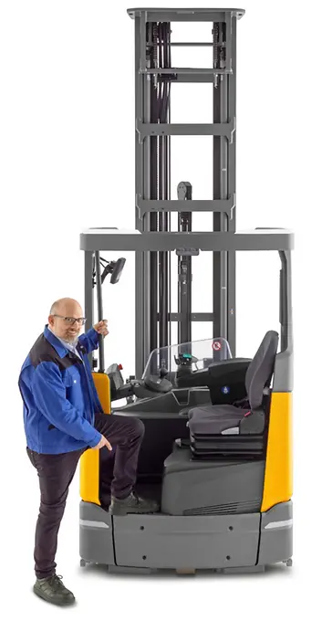 Gracias a su novedosa construcción, no solo convencen por medio de una mejor seguridad y ergonomía, también lo hacen mediante un confort máximo de marcha. La potente batería de iones de litio es extremadamente compacta y permite un uso flexible mediante su capacidad de carga rápida e intermedia. Un puesto de trabajo generosamente dimensionado con un acceso bajo, mucho espacio libre para el usuario y vista panorámica óptima, facilita un trabajo saludable. Los sistemas de asistencia inteligentes y las numerosas opciones adicionales, como tejadillo con luneta panorámica, láser de posicionamiento o la tira de luz LED integrada SmartStripe, procuran la máxima protección en el almacén.